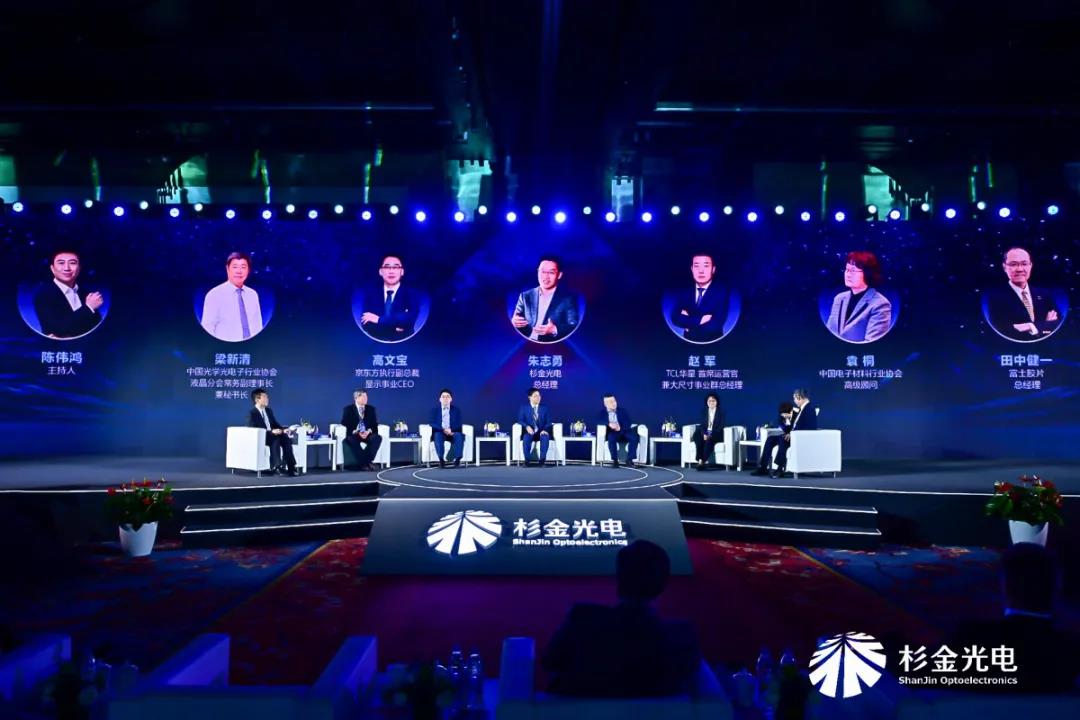 中國光學光電子行業協會液晶分會常務副理事長兼秘書長梁新清,中國電子材料協會專家袁桐,杉金光電總經理朱志勇,京東方執行副總裁、顯示事業CEO高文寶,TCL華星首席運營官趙軍,富士總經理田中健一圍繞中國顯示產業如何進一步加強開放合作,實現我國科技自立自強進行了深入探討,帶來了精彩紛呈的分享與對話。