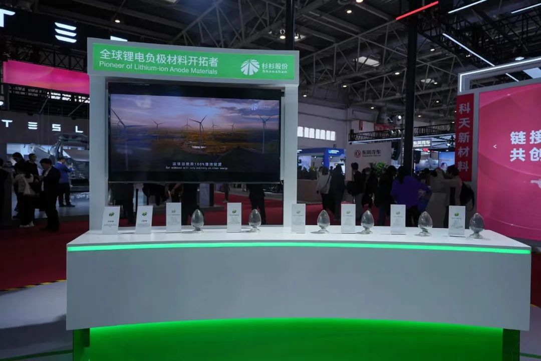 展會現場,杉杉展臺展示空間以科技之樹開始演變,寓意著杉杉以創新為基石,與世界進行緊密的鏈接。通過環形屏、透明屏、115寸巨幕TV等新型顯示技術,展示了應用于最新一代高端電動車的4C快充負極、行業領先的硅基負極和硬碳負極產品,以及高端LCD、OLED、車載用偏光片等產尖端顯示產品,吸引眾多觀眾參觀駐足。
