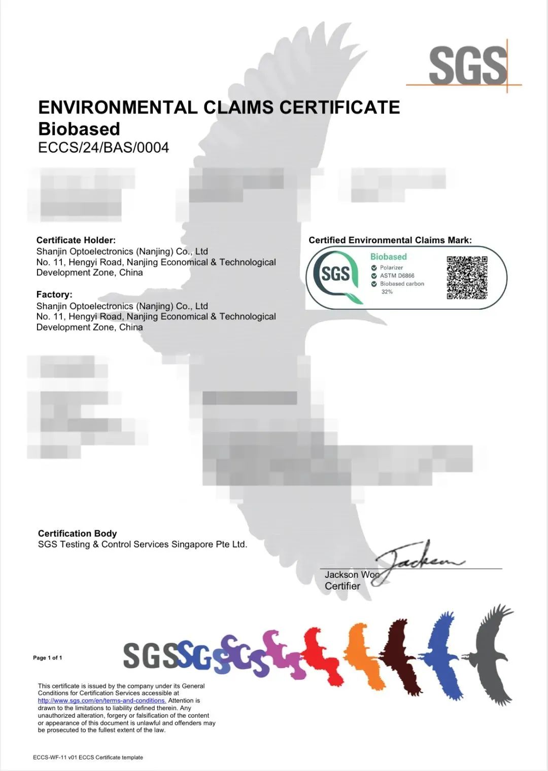 近日,杉金光電南京工廠榮獲了具有全球影響力的“SGS綠色標志”-ENVIRONMENTAL CLAIMS CERTIFICATE認證證書。這不僅標志著杉金光電在綠色制造和環(huán)保方面的卓越努力得到了國際社會的廣泛認可,更彰顯了公司踐行綠色低碳高質(zhì)量發(fā)展、致力于可持續(xù)發(fā)展的堅定決心。