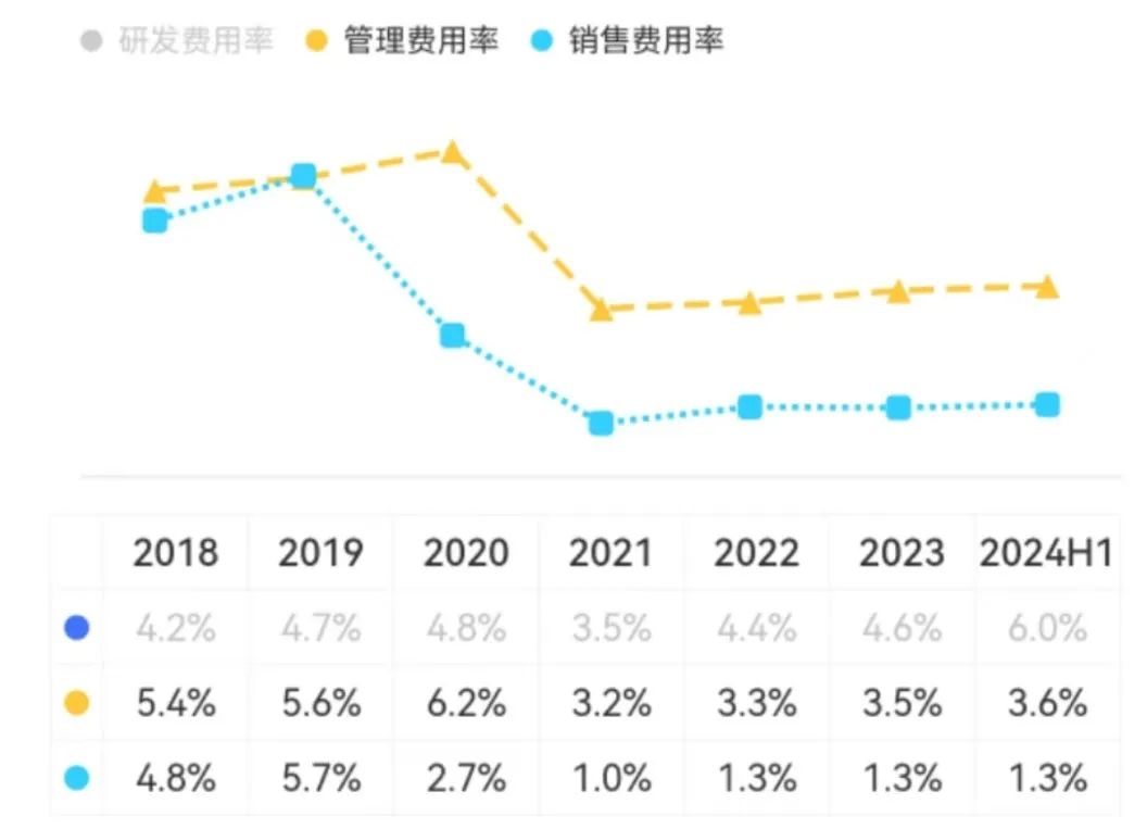 費用端上,2024年上半年,其銷售費用率、管理費用率也依然控制在低位水平。