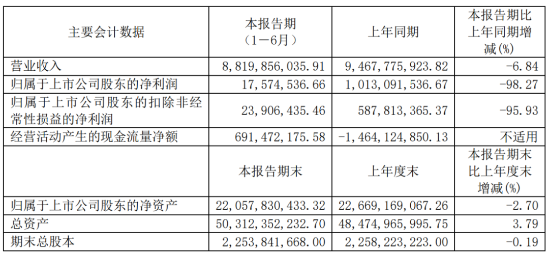 今年上半年,杉杉股份實現營業收入88.2億元,實現歸母凈利潤1,757.45萬元,同比均呈現負增長。