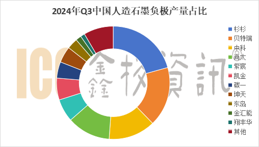 據ICC鑫欏資訊數據顯示,2024年Q3國內人造石墨負極材料總產量約49萬噸,上海杉杉占比21%,憑借著領先的技術優勢和市場地位,市占率仍居首位。