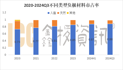 就材料類型來看,國內人造石墨負極仍占據主流地位,人造負極占比不斷提升,2024年Q3占比達約88%,創歷史新高。