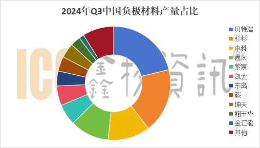 市場競爭格局方面,據ICC鑫欏資訊數據顯示,2024年Q3貝特瑞負極材料占比仍居國內首位,上海杉杉占比繼續提升,中科星城和尚太科技持續向好,廣東東島、河北坤天和碳一繼續呈現穩中有升的勢頭。